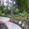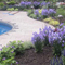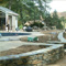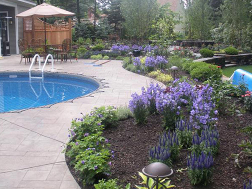 A fire pit with a round seat wall enclosure was installed and set apart from the pool by walkways and a birch grove planted around it. The plantings are meant to give focus to the time when the pool will be used most, summer.